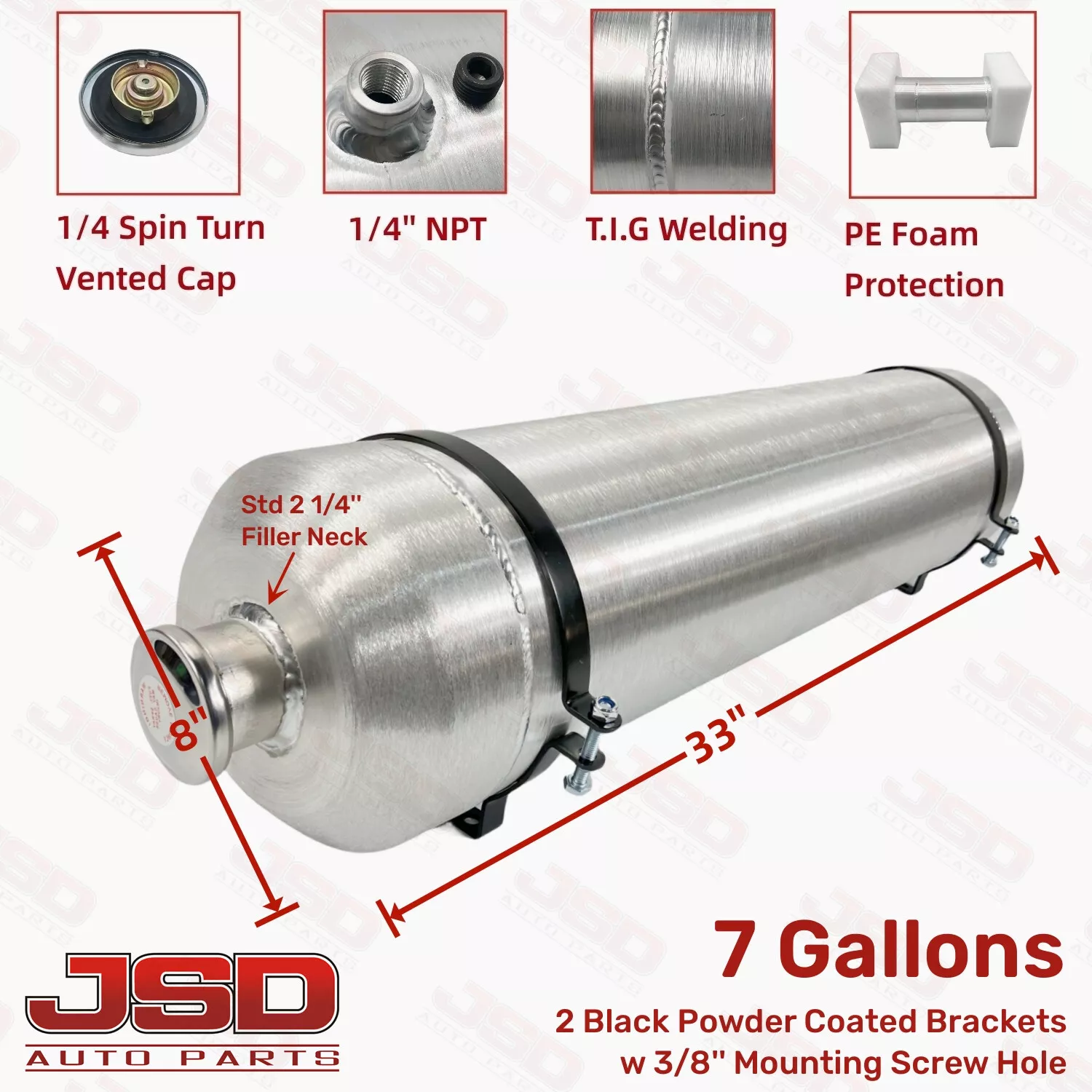 The JSD Aluminum Spun Fuel Tank is designed for durability and efficiency. Its lightweight aluminum construction ensures ease of handling and installation. The vented gas cap provides optimal ventilation, preventing pressure build-up. The included bracket holders make mounting the tank a breeze, ensuring a secure and stable setup.